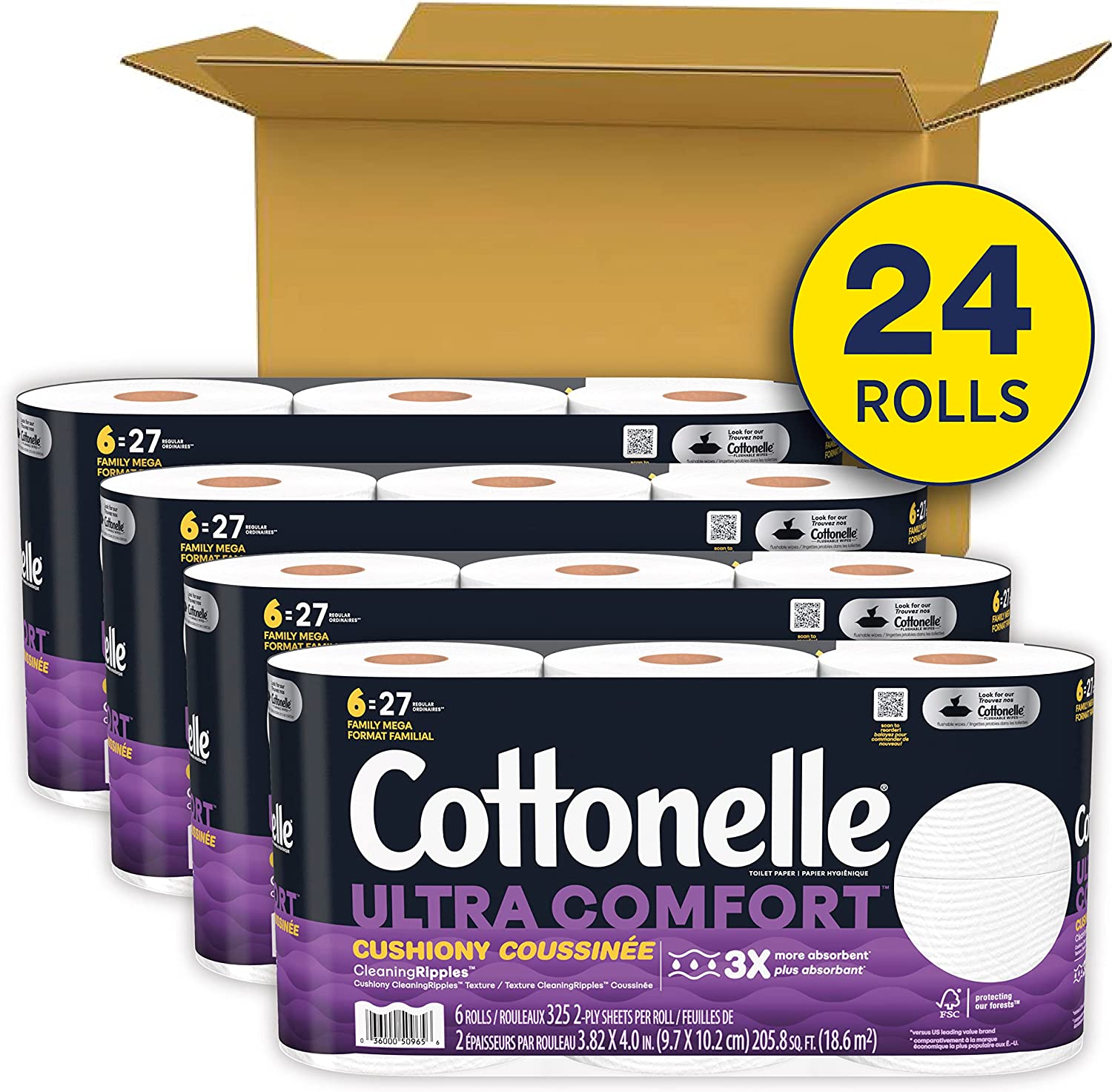 - 24 FAMILY MEGA ROLLS: Cottonelle Ultra Comfort Toilet Paper with Cushiony CleaningRipples Texture, 24 Family Mega Rolls (4 packs of 6); 325 sheets per roll .