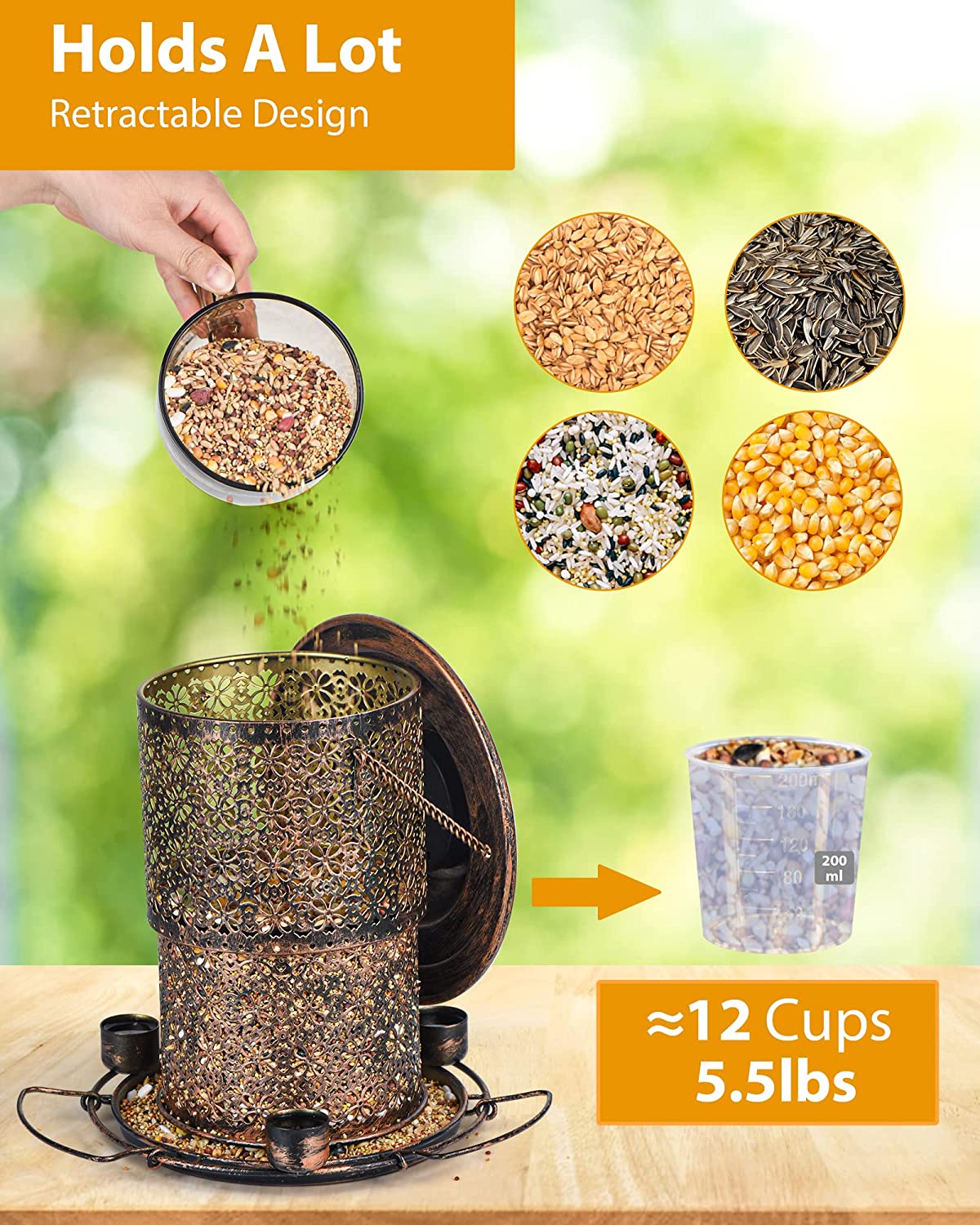 • 🦜[Unique Design-360° Feeding]Our retractable wild bird feeder is made by two part cylinder that nest into each other. Made of heavy-duty metal which is sturdy and durable to resist all kinds of weather and squirrel proof. 360° panoramic gazebo bird feeder, wider roof shields the birds from sun and rain. The strong bars and water cup is suitable for multiple clinging birds can dine at one time.